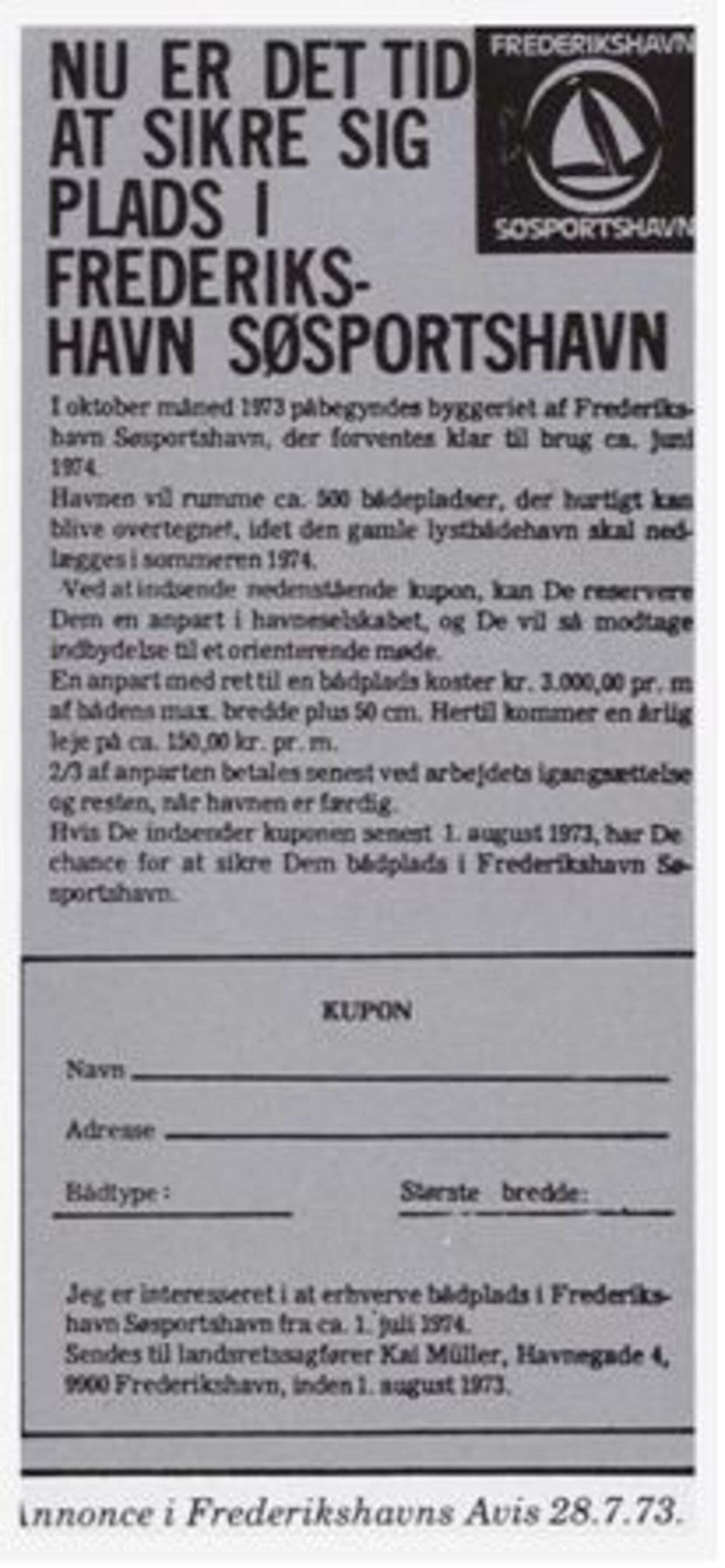 Den 23. oktober 1973 blev det afholdt stiftende Generalforsamling i kommanditselskabet Frederikshavn Søsportshavn med Frederikshavn Sejlklub som komplementar. Den dag var en stor dag i sejlklubbens historie.
